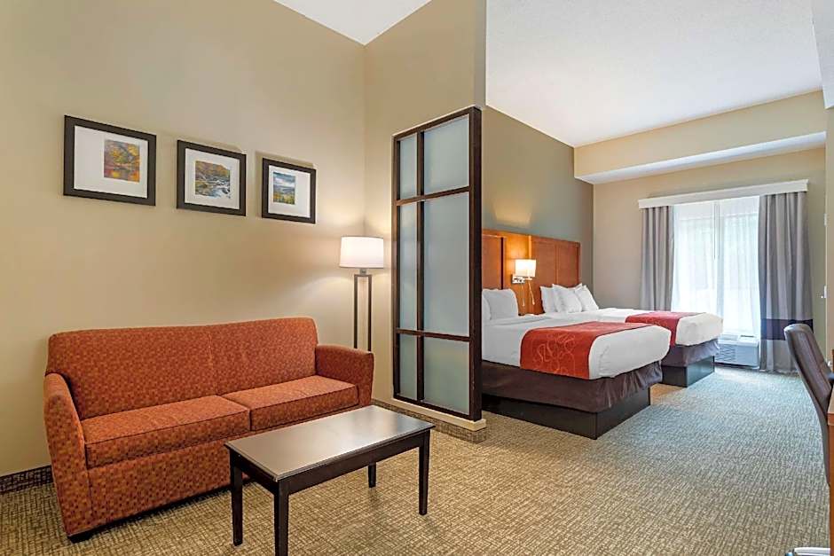 After a refreshing swim in the heated indoor pool, why not unwind in the comfort of your spacious suite? The hotel offers a variety of suite options, including those with King or Queen beds, some accommodating up to eight guests — perfect for families or groups traveling together. Each suite provides plenty of space to relax after a day exploring the scenic mountain views or attending a local event, making your stay both comfortable and convenient.